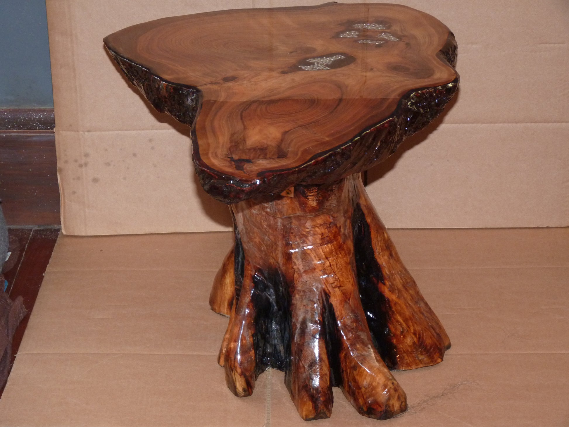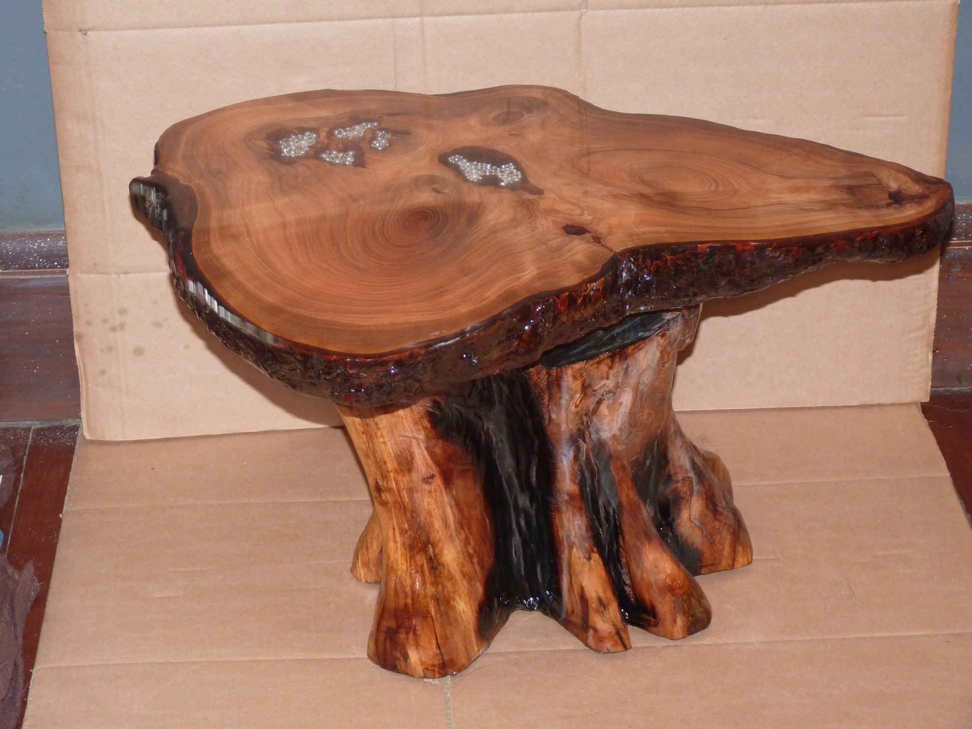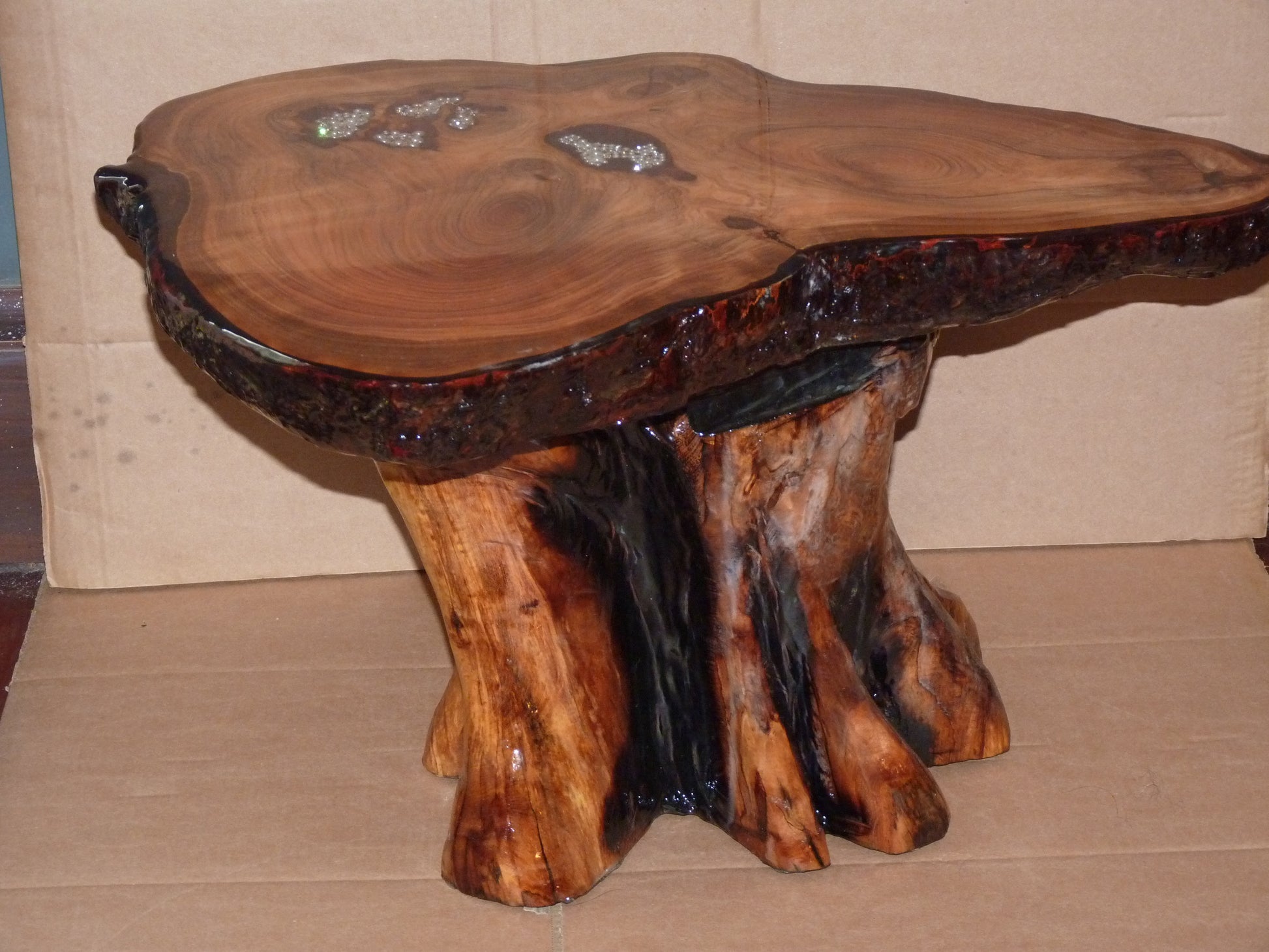 This is a Hand Carved resin tree cookie ( slice of tree ) the base haas been chainsaw carved to look like a tree. pearls have been inserted into the natural holes in the wood, the table has been covered in resin as well as the base, this gives the table a glass like finish.